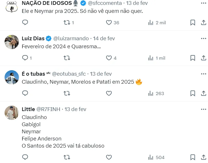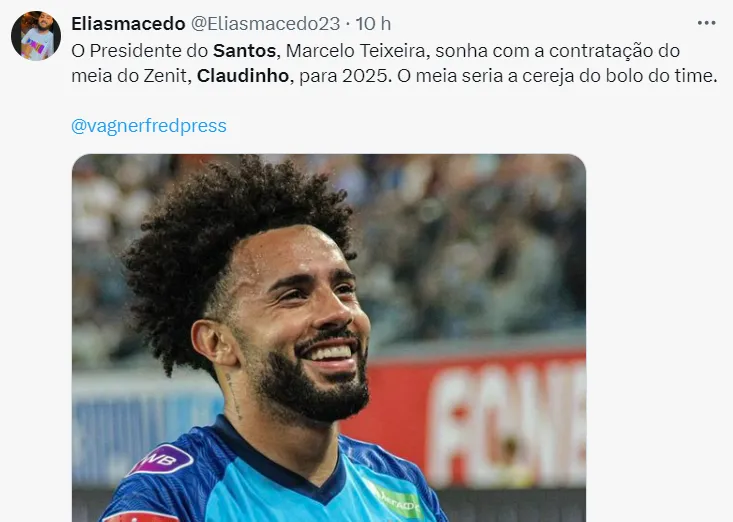 “O atleta que o Santos sonha para ser a grande cereja do bolo é Claudinho. Jogador que nasceu aqui na base do clube, brilhou com a camisa do Bragantino e hoje está no futebol russo. Esse é o sonho do Marcelo Teixeira”, disse o jornalista.