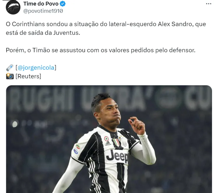 O Corinthians se mostrou interessado em Alex Sandro em meio à saída do lateral da Juventus, clube cujo ele tem contrato até julho de 2024. Por ser uma operação sem custos entre os clubes, o jogador era visto com bons olhos.