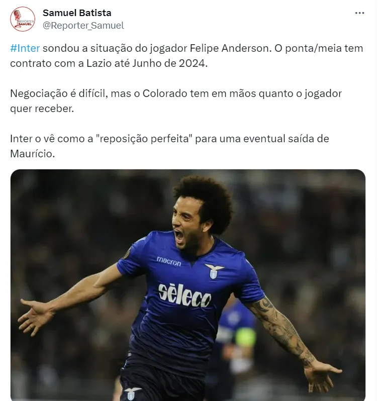 De acordo com informações de Samuel Batista, o Internacional fez uma sondagem inicial para entender melhor sobre Felipe Anderson, da Lazio, e já tem em mãos quanto teria que pagar por seu futebol.