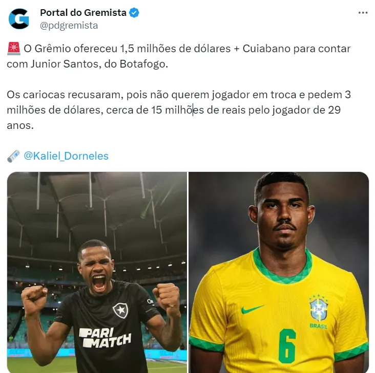 Para convencer o Botafogo, o Grêmio oferece o futebol de Cuiabano e mais R$ 7,4 milhões ao time do Rio de Janeiro por Junior Santos. A oferta foi recusada pelo Glorioso.