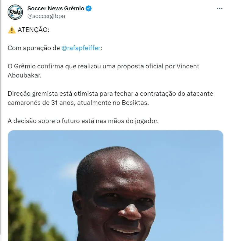 Otimista para fechar um acordo, a decisão final está nas mãos de Vincent Aboubakar. O Grêmio já realizou a oferta para o Besiktas e agora aguarda o atleta, que tende a aceitar a viver um novo desafio no Brasil, já que o time gaúcho está otimista em anunciar o camisa 9.