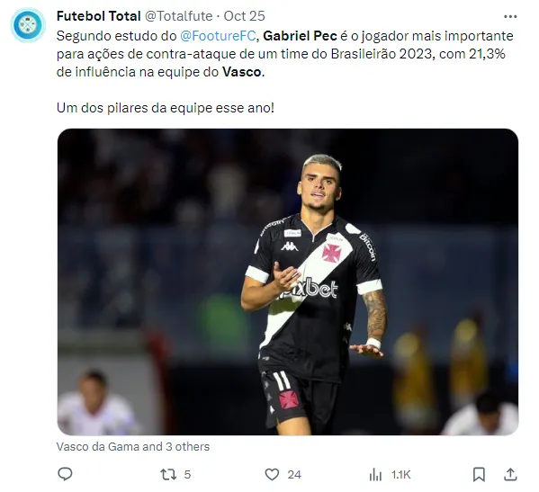 Um desses nomes é o destaque do Vasco na temporada, Gabriel Pec. Em 2023, o jogador soma 40 jogos disputados, com 12 gols marcados e outras quatro assistências fornecidas. No Brasileirão, são seis gols assinalados e passes para outros três em 27 partidas.