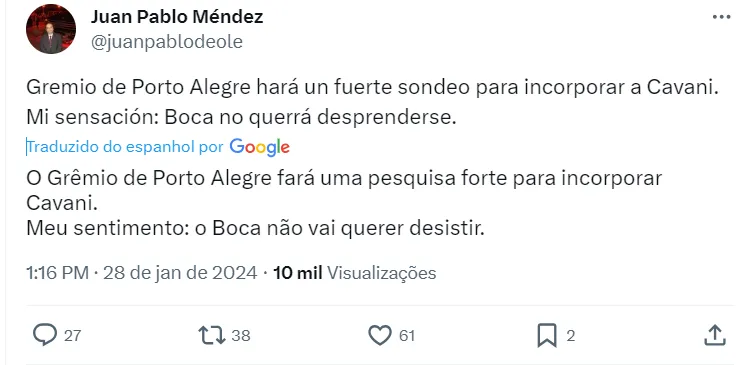 A informação do interesse gremista é passada por Juan Pablo Méndez. De acordo com ele, o Grêmio irá com tudo para tirá-lo do Boca Juniors, que fará jogo duro diante do interesse do Tricolor.
