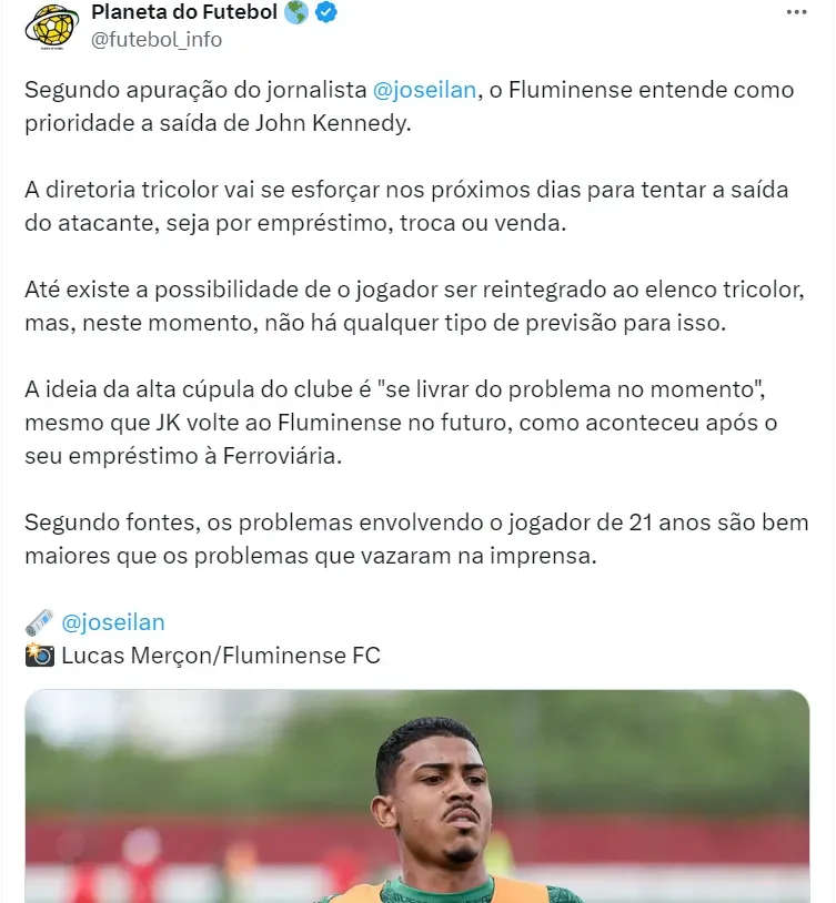 O jornalista Samir Carvalho sugeriu uma troca de jogadores entre Corinthians e Fluminense, em qual John Kennedy, do time carioca, está envolvido, em meio às informações de que os cariocas buscam se desfazer do atleta.