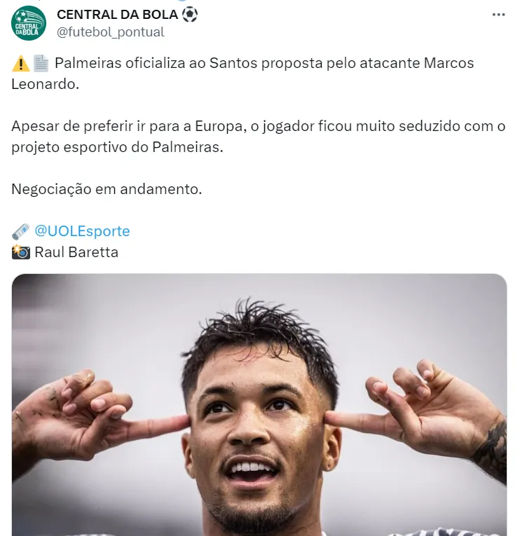 No Brasil, o Palmeiras fez uma primeira oferta oficial para contar com o futebol de Marcos Leonardo em 2024. A fonte não entra em detalhes sobre os números da oferta, mas conta que o jovem ficou seduzido em jogar no Palmeiras devido ao projeto