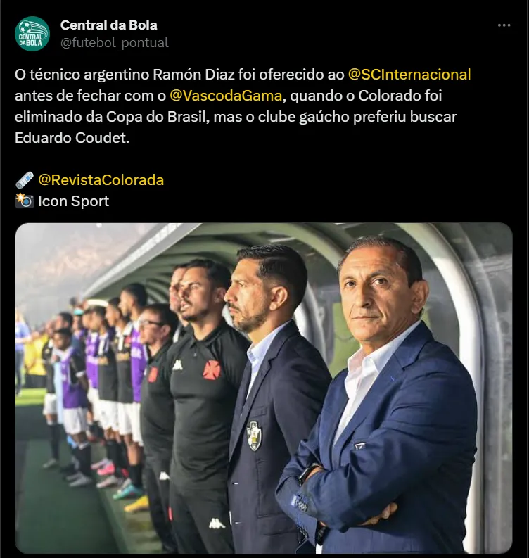 De acordo com as informações publicadas pelo portal “Revista Colorada”, o técnico Ramón Díaz foi oferecido ao Internacional após a eliminação da Copa do Brasil, antes de fechar com o Vasco.