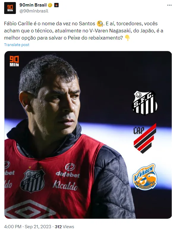 De acordo com informações do GE, Fábio Carille estaria considerando aceitar a proposta do Santos, uma vez que o clube estaria disposto a pagar a multa rescisória do treinador, que está estimada em cerca de 1,5 milhão de dólares (R$ 7,2 milhões). Atualmente, Carille está no V-Varen Nagasaki, do Japão, com contrato vigente até o final de 2024.