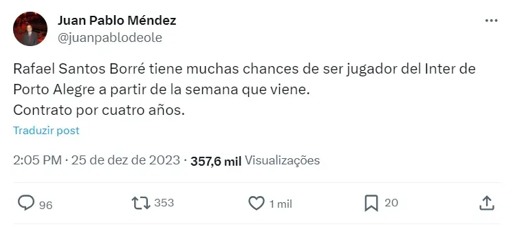 “Borré já é jogador do Internacional de Porto Alegre. Anúncio iminente”, diz Juan Pablo Méndez, em sua rede social.
