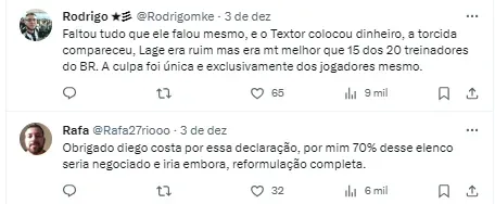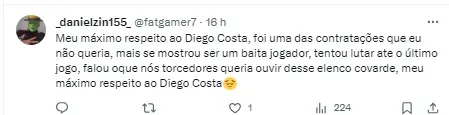 E algo que chamou a atenção da torcida do Botafogo foi o desabafo do atacante Diego Costa. O melancólico empate em gols diante do Cruzeiro no Newton Santos encerrou as chances de título da equipe.