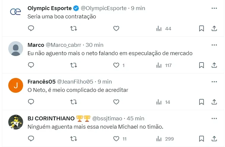“O Michael, que joga lá, no futebol saudita, quer muito deixar o país para jogar no Corinthians. Isso é informação minha. E não é o Corinthians que quer o Michael, é o jogador que deseja sair de lá e jogar no Corintians”, disse Craque Neto, ao vivo, na Band.