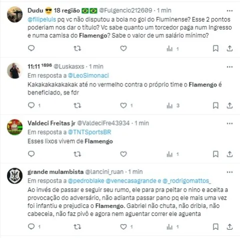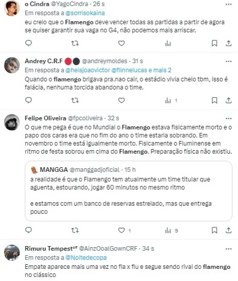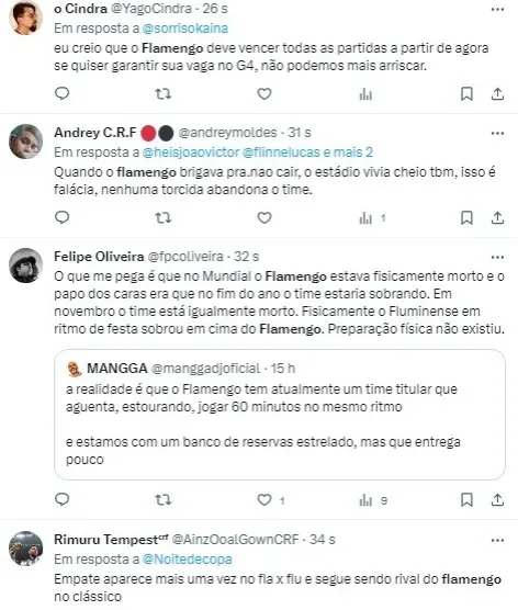 “Ora, se não consegue nem vencer um Fluminense que já pensa em 2024, como podemos colocar o Flamengo na disputa pelo título? Acho que a briga vai ficar mesmo entre Grêmio, Bragantino e Palmeiras. E você, o que acha?”, complementou o comentarista.
