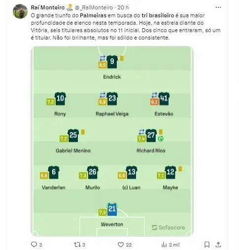 Dessa forma, Neves coloca o Palmeiras como o grande favorito ao título, destacando sua determinação em manter-se no topo do futebol brasileiro e em adicionar mais uma conquista ao seu renomado histórico.