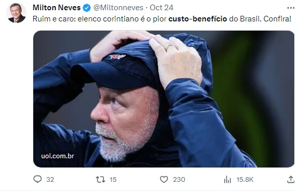“Anos (ou até mesmo décadas) atrás tornou-se popular no futebol a expressão “bom e barato”, para classificar elencos de clubes grandes que precisavam economizar dinheiro. Mas não é que, no futebol atual, o Corinthians conseguiu criar um outro termo? E este, convenhamos, sem sentido algum. Trata-se do “ruim e caro”.”, comentou Milton Neves sobre o elenco corintiano.