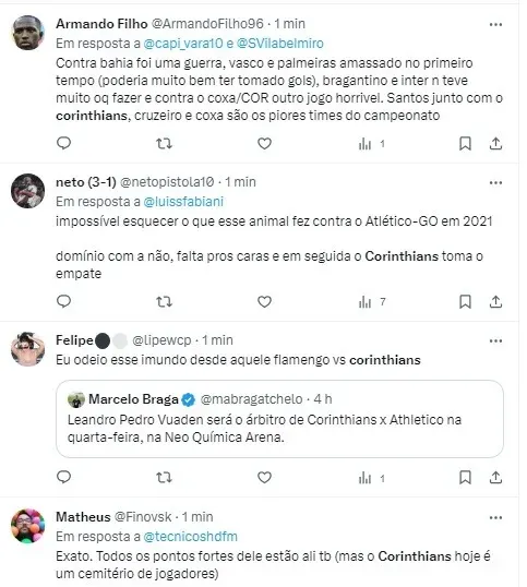“Chegou a ser engraçada a reação corintiana após o apito final do correto Anderson Daronco. Choraram como nunca contra a arbitragem, alegando que não foi pênalti em Soteldo. Ah, se eles tivessem apresentado esta mesma revolta também aquele dia contra o Grêmio, não é mesmo? E o pior: estão chorando sem razão! Bruno Mendez chega atrasado e comete a penalidade no baixinho venezuelano do Santos. Não tem discussão!”, escreveu.