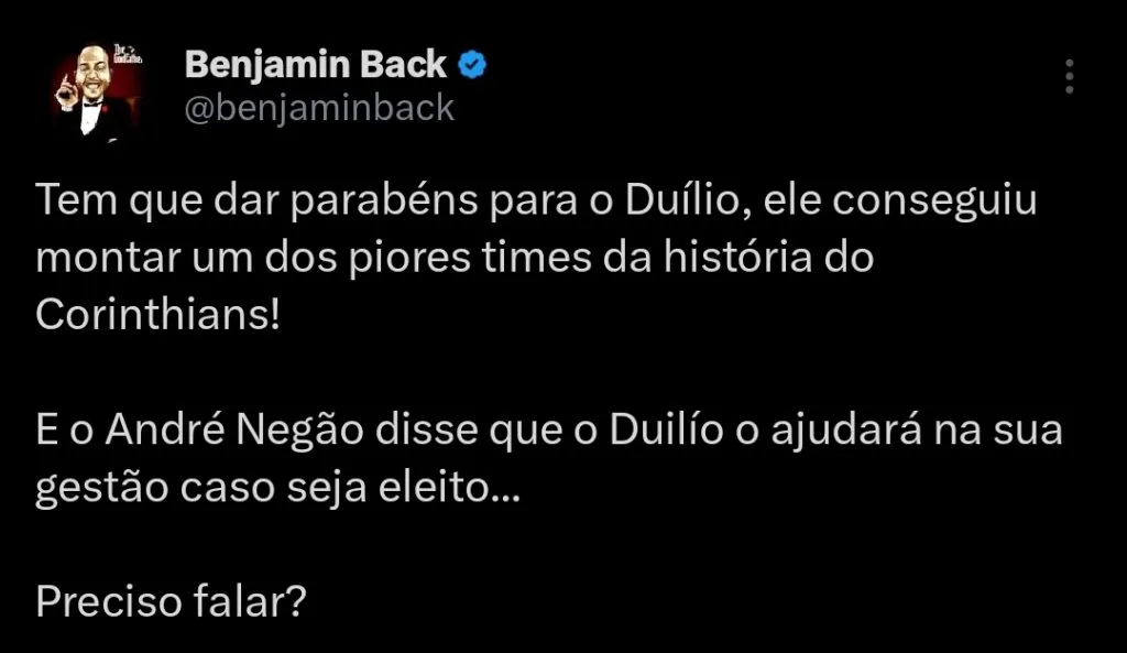 “Ah, Timão, e é verdade que a situação já anda um pouco mais confortável na luta contra o Z-4. Mas ainda é preciso se esforçar para chegar aos 45 pontos, viu? Vocês estão muito longe ainda das tão sonhadas férias“, concluiu Milton.