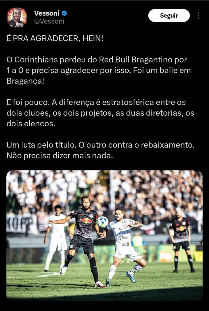 Em publicação feita na sua coluna no Uol, Milton Neves resolveu comentar sobre a derrota do Corinthians neste domingo para o RB Bragantino. O jornalista resolveu cornetar a equipe, e apontou um possível rebaixamento na competição nacional.