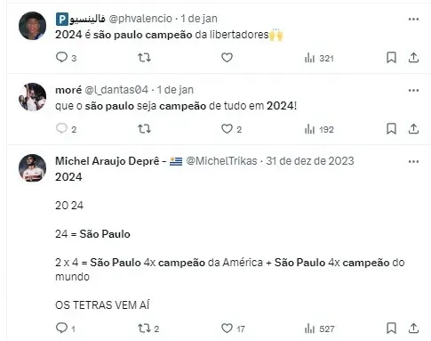 “Em 2024, o São Paulo disputará a Libertadores, a paixão maior de todo torcedor são-paulino, e tenho para comigo que será um dos fortes candidatos ao caneco. Viu, Palmeiras? Viu, Flamengo? Viu, Atlético?”, finalizou.