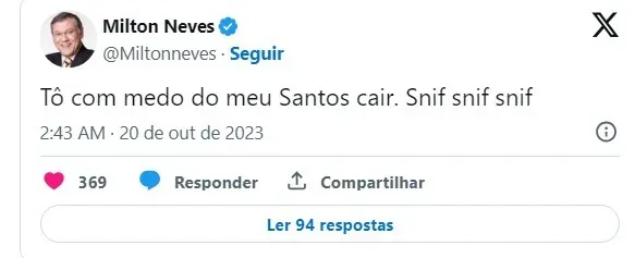 O renomado jornalista esportivo Milton Neves, em sua coluna no UOL Esporte, fez um alerta à equipe do Santos, que agora enfrenta a real possibilidade de sua primeira queda na história. Com esse resultado, o Santos estacionou nos 30 pontos e ocupa a 17ª posição na tabela, sendo o “porteiro” da zona de rebaixamento, restando apenas 11 rodadas em disputa.