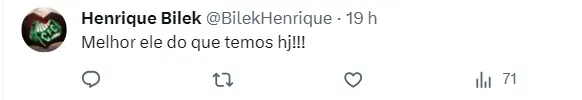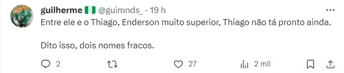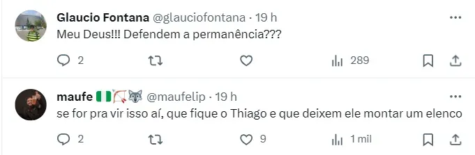 “Continuo repetindo que eu estou falando faz tempo: se for para isso não precisa de SAF” , “Quem apoia a permanência do Thiago só pode ter neurônios faltando” , “Meu Deus! Defendem a permanência?” , “Na boa, me assusta o fato de haver uma ala dentro do clube que apoia permanência do estagiário” , “Tá de sacanagem que há quem defende a permanência desse estagiário” , “Não sei qual é a pior, apoiar Enderson ou a permanência do Kosloski”, escreveram no Twitter.