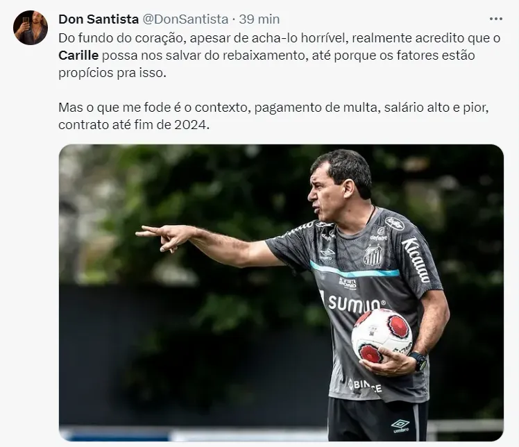 “O Santos ainda tem um técnico brasileiro em mente, que está no mercado e estão tentando acertar com ele. Não é Fábio Carille”, disse o jornalista, que, apesar de não revelar o verdadeiro nome, indicou quem pode ser o técnico do Santos até o final do ano, caso o Peixe não tenha sucesso nas tentativas de contratar Carille ou outro nome no mercado.