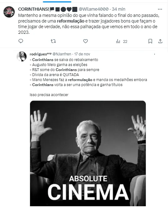 “Foi um time que em nomes, individualmente, é muito forte, mas no coletivo passou longe do que a diretoria e as comissões técnicas esperavam. Então acredito que esse elenco que não deu certo precisa fazer uma reformulação para no próximo ano o Corinthians voltar a ser o Corinthians. E sobretudo, quem estiver chegando buscar o DNA do time“, afirmou.