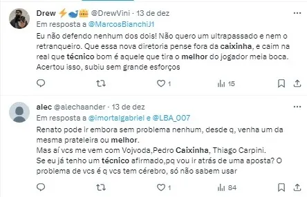“Fico dividido entre os dois lusitanos, mas fico com Caixinha. Ele não apenas fez o Bragantino chegar onde chegou, como pela personalidade que tem, pela entrevista que deu. Eu gosto muito deste cidadão. Ano passado votei no Vojvoda, esse ano voto no Caixinha, e perco orgulhosamente”, brincou Juca Kfouri.