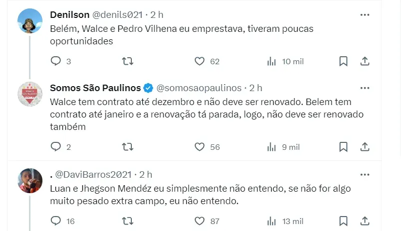 Completando a lista, aparecem os nomes de Marcos Paulo, Felipe Alves, Raí Ramos, Walace, Matheus Bélem e Pedro Vilhena. Todos esses estão na lista de saídas do gigante do Morumbi.