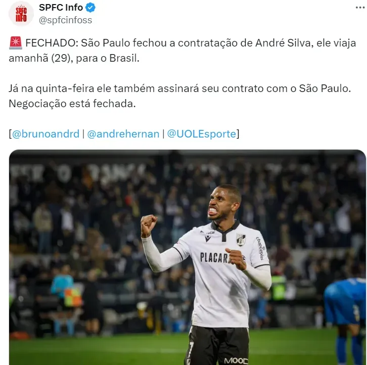 Para conquistar a América novamente, o São Paulo acertou a contratação do atacante André Silva, de 25 anos de idade, que estava em Portugal, defendendo as cores do Vitória Guimarães.