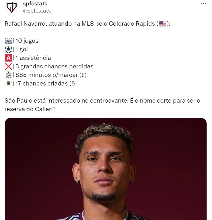 O atacante Rafael Navarro, do Palmeiras e que atualmente está emprestado ao ao Colorado Rapids, dos Estados Unidos, é mais novo alvo da diretoria do São Paulo. A contratação do atacante está sendo analisa pelo clube.