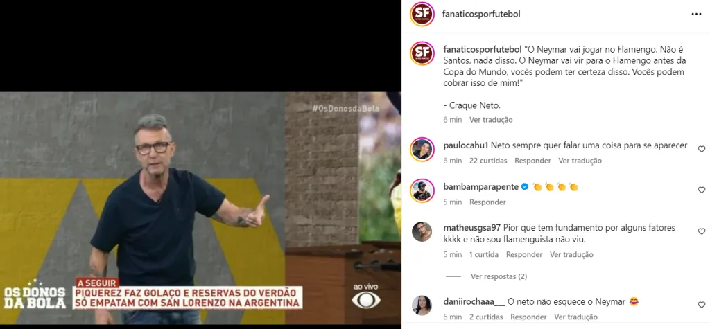 “O Neymar vai jogar no Flamengo. Não é o Santos, nada disso. Ele vai vir para o Flamengo antes da Copa do Mundo, vocês podem ter certeza disso. Vocês podem me cobrar isso”, cravou Craque Neto.