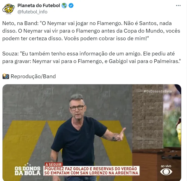 “Eu tenho essa informação de um amigo. Ele até pediu para gravar: Neymar vai para o Flamengo, e Gabigol vai para o Palmeiras”, disse Souza.