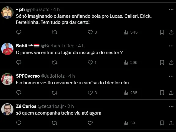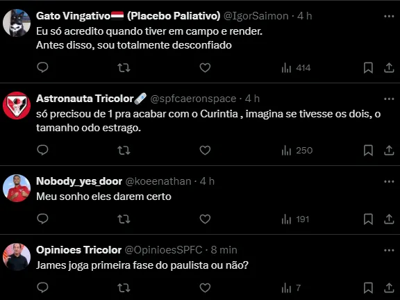 “O meia colombiano poderá jogar o Campeonato Paulista a partir da próxima fase. James conversava com outros clubes. Sem avanço nas conversas, repensou sua decisão e opta por ficar no São Paulo“, completou o jornalista.
