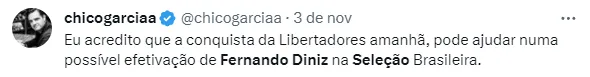 Porém, o Craque também afirmou que o ideal seria Diniz focar apenas na Seleção: “Eu acho que assim, ele pode disputar o Mundial, e depois ele se dedicar só pra seleção brasileira e o Fluminense buscar um outro treinador”
