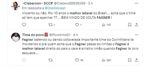 “Pra mim o Fagner mesmo no momento ruim dele é ainda o melhor lateral direito que a gente tem hoje no Brasil”, disse o ex-São Paulo. “É verdade. Ô Fagner, você joga muita bola”, afirmou o apresentador.
