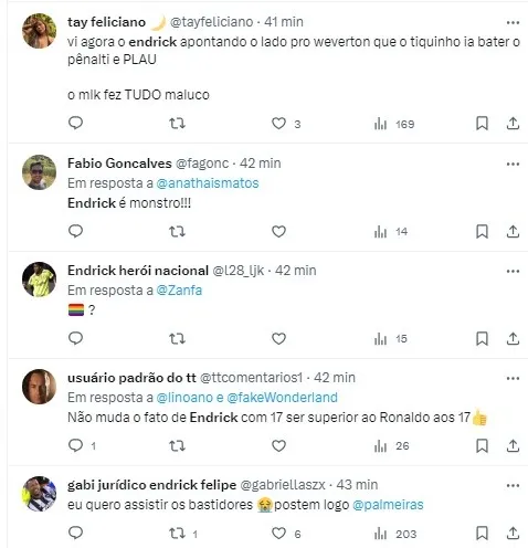 “Esse menino tem 17 anos e o São Paulo perdeu ele. O que ele joga… já no Mundial tinha que ter levado. Esse moleque ganhou três títulos jogando muita bola. É um dos grandes centroavantes dos últimos anos. Para mim, o Endrick vai ser 1 milhão de vezes melhor do que o Vinícius Júnior. Sabe chutar de perna direita, perna esquerda, bom de cabeça, é forte… e o Abel Ferreira achou que estava certo. O senhor fez o Palmeiras não chegar na final da Libertadores.”, afirmou.