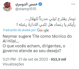 Na última semana, inclusive, @stamp1515 publicou que Neymar teria indicado a contratação de Tite ao Al-Hilal. Ambos trabalharam juntos na Seleção Brasileira de 2016 a 2022.
