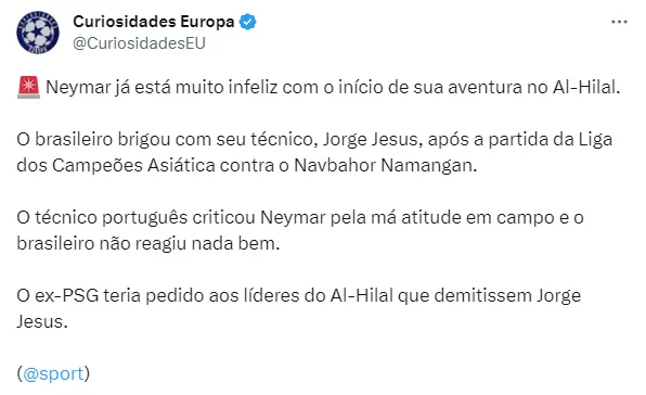Isso porque, de acordo com o jornal Sport, da Espanha, Neymar não está contente com Jorge Jesus e teria, até mesmo, pedido ao Al-Hilal para que desligasse o treinador.