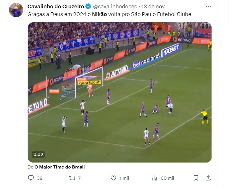 Para 2024, é informado por fontes que o São Paulo tem planos para Nikão. Emprestado ao Cruzeiro, Dorival Jr gostaria de aproveitá-lo no Morumbi para o próximo ano.