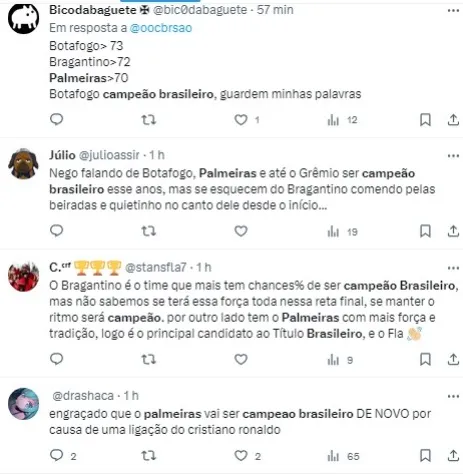 De acordo com dados da UFMG (Universidade Federal de Minas Gerais), o Palmeiras detém 25,4% de chances de conquistar o título do Brasileirão. Red Bull Bragantino (32,3%) e Botafogo (35,2%) são os clubes que lideram as probabilidades de vitória no campeonato. A disputa pelo título promete continuar emocionante durante a reta final, com várias equipes buscando a glória no Brasileirão de 2023.