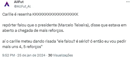 E se tratando do elenco e peças novas na equipe, o técnico Fabio Carille foi questionado sobre a chegada de um goleiro e se virão mais peças pra encorpar ainda mais o grupo que teve 13 contratações. Vale lembrar que o clube tem negociação avançada com o goleiro Gabriel Brazão, da Inter de Milão.