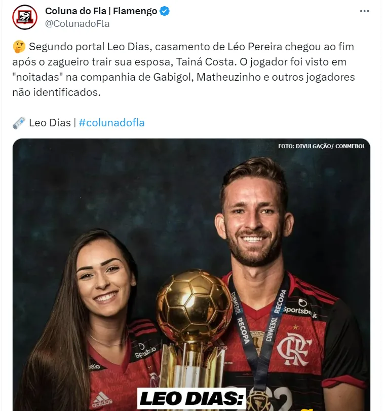 A informação do momento, de acordo com Léo Dias, é que Léo Pereira teria traído sua esposa, Tainá Costa, e, assim, seu casamento chegou ao fim. O colunista entra em mais detalhes e relata que o atleta foi visto em “noitadas” com Gabigol, Matheusinho e outros jogadores do Flamengo, cujos nomes não foram revelados.