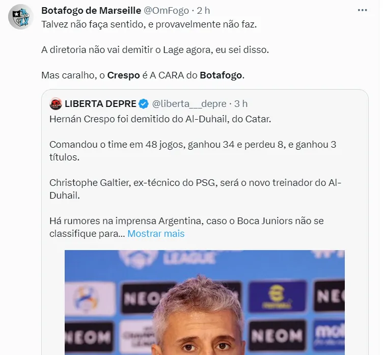 Nas redes sociais, a torcida do Botafogo vem discutindo o nome de Crespo como um possível substituto de Bruno Lage, que enfrenta grandes dificuldades neste momento sob o comando do Glorioso, apesar de ainda ser o líder do Brasileirão 2023.