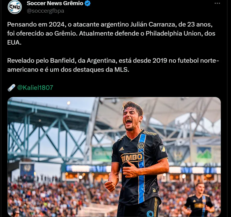 De acordo com as informações publicadas pelo jornalista Kaliel, o atacante Julián Carranza, que joga atualmente no Philadelphia Union, dos Estados Unidos, foi oferecido para o Grêmio em 2024.