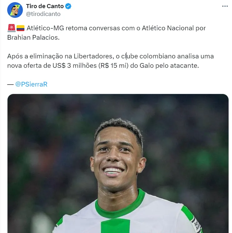 A informação foi passada por Pipe Sierra. De acordo com a fonte, o Galo retomou as conversas com o time colombiano pelo atacante com uma oferta de R$ 15 milhões na mesa do clube sul-americano.