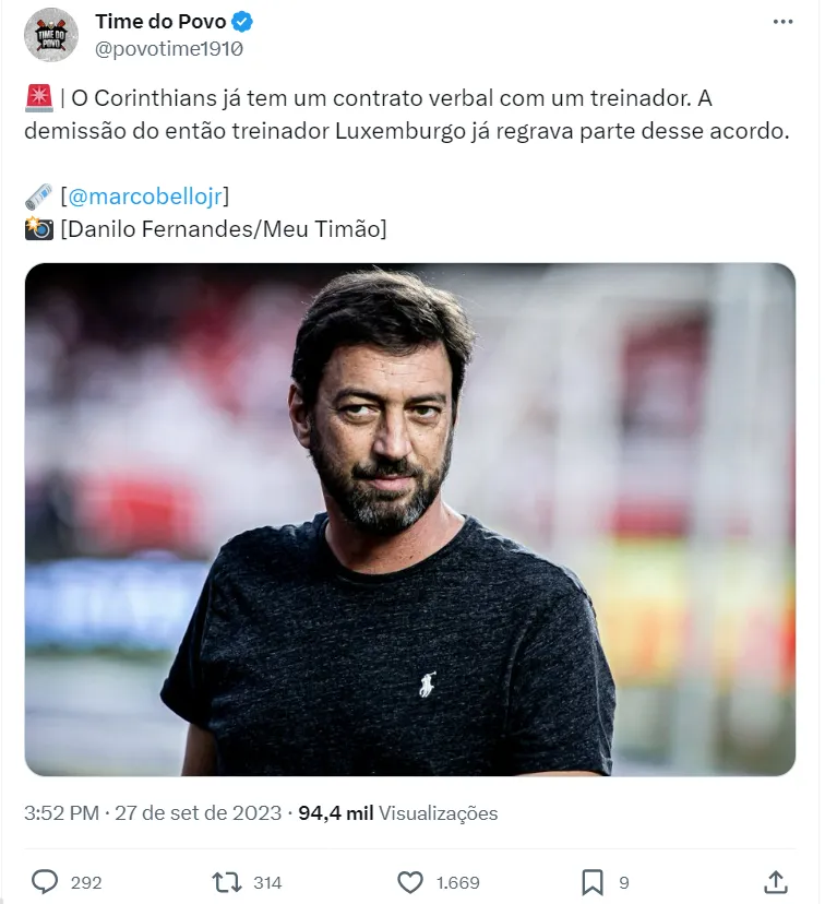 Segundo Marco Bello Jr., o Corinthians já tem um acordo verbal com um novo treinador para substituir Luxa. Ele não revela o nome, mas afirma que a demissão de Luxa faz parte desse acordo.