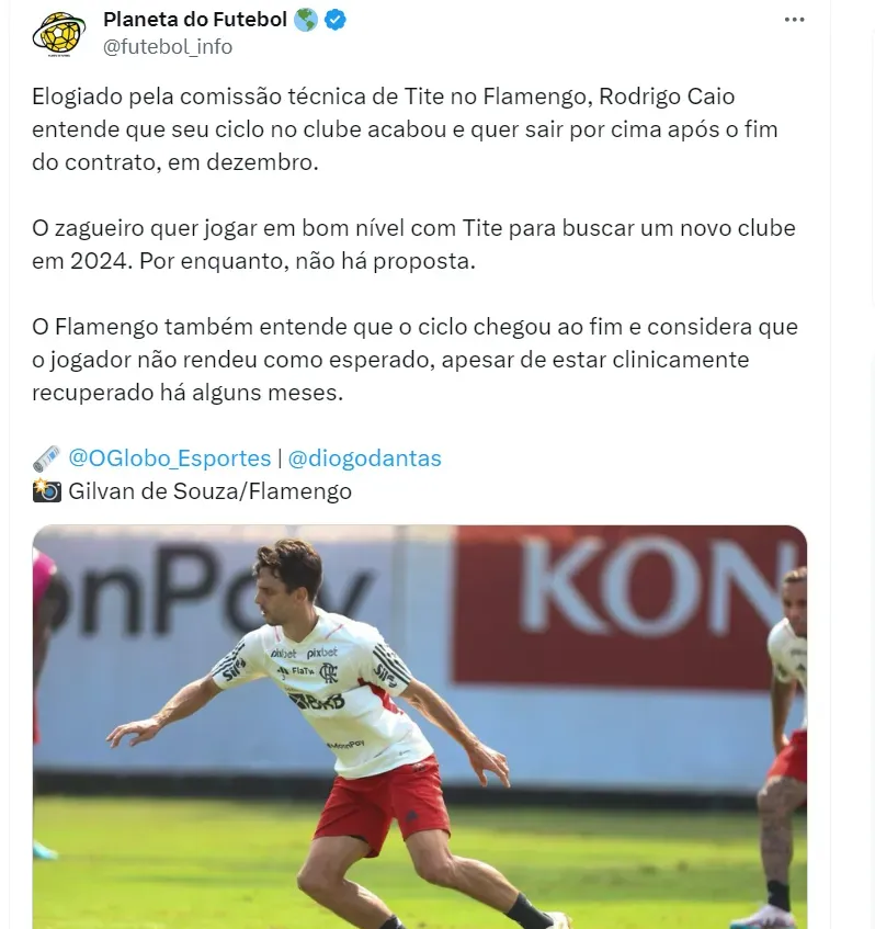 Um dos jogadores que deixarão o Flamengo ao final de 2023 é o zagueiro Rodrigo Caio, que está chegando ao fim de seu contrato e não o renovará. O jogador entende que seu ciclo no clube terminou e buscará um novo desafio em sua carreira no ano seguinte, como informou o ‘O Globo Esportes’.