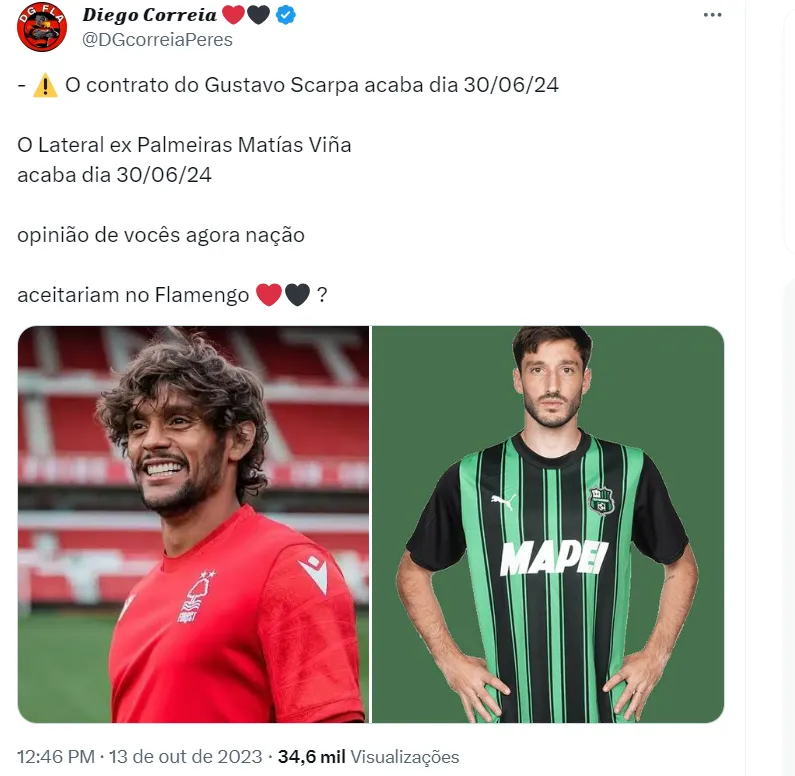 O nome do lateral Matías Viña também foi sugerido pela torcida do Flamengo como possível reforço para 2024. O contrato de Filipe Luis está se encerrando e não deverá ser renovado. Atualmente, Matías Viña defende o Sassuolo, emprestado pela Roma. Neste momento, não há informações sobre qualquer tipo de conversa entre as partes.