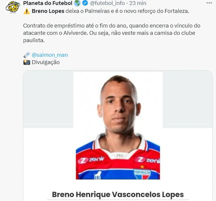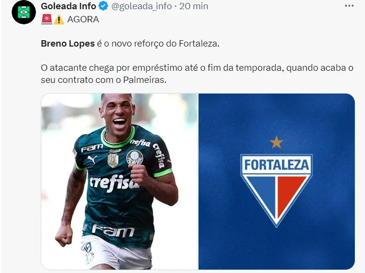 O acordo de Breno Lopes com o Fortaleza é de um contrato de empréstimo até o final da temporada. No entanto, como o atacante está em fim de contrato com o Verdão, ele encerra sua história pelo clube.