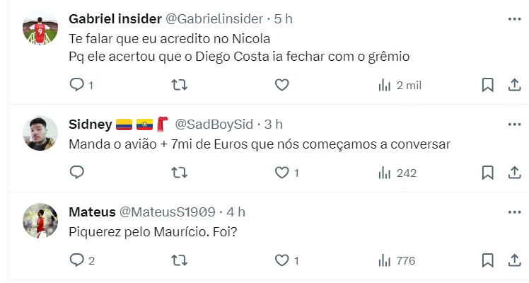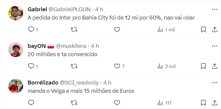 “Na manhã desta sexta-feira (9), eu fui atrás de uma pessoa do Palmeiras que disse que foram feitas 3 propostas ao Internacional e o Inter sempre pedindo na casa dos € 12 milhões. O André Cury, quem conduz a negociação, não desistiu da operação e ainda tenta convencer o Inter a fazer o negócio”, afirma Nicola.