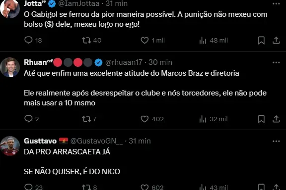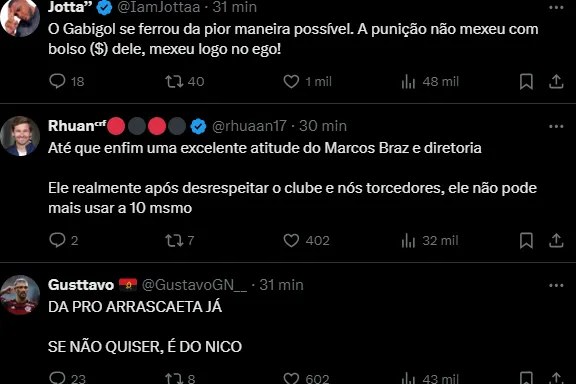 “O Flamengo informa que, após reunião com o vice-presidente de futebol, Marcos Braz, e demais diretores do departamento, o atleta Gabriel Barbosa foi multado e comunicado pelo dirigente de que não usará mais a camisa 10 rubro-negra nas competições possíveis de alteração da numeração”, destaca o Mengão.